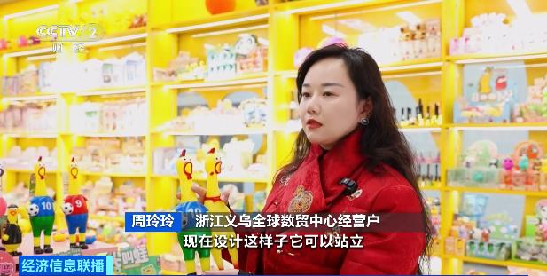 浙江义乌全球数贸中心经营户 周玲玲:以前的腿没办法站立,现在设计成可以站立的造型,墨西哥过来的客户直接到厂里,当天过来,明天30%的定金就到手了。