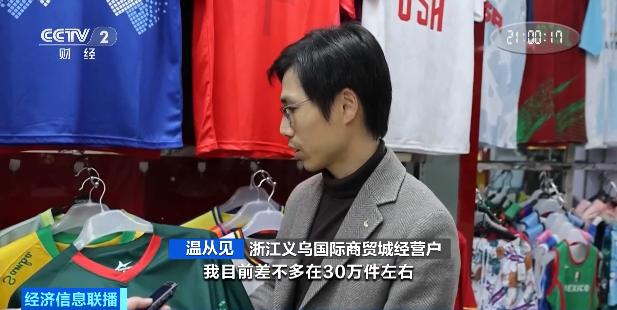 浙江义乌国际商贸城经营户 温从见:一款墨西哥球服,目前已经订出去30万件左右,一款阿根廷球服应该在20万件左右。