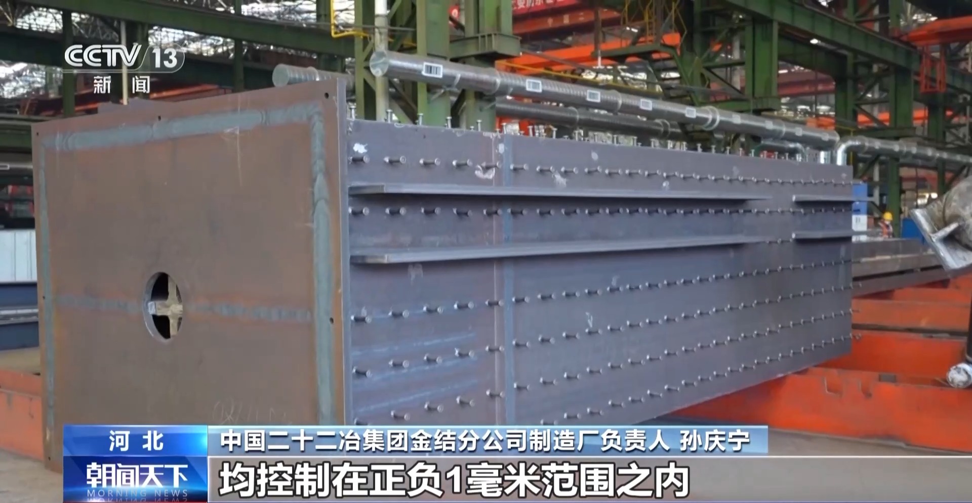 中国二十二冶集团金结分公司制造厂负责人 孙庆宁:构件的长度、宽度、对角线均控制在正负1毫米范围之内,目前我们加工的构件已经有200余件,一次合格率均达到了100%。
