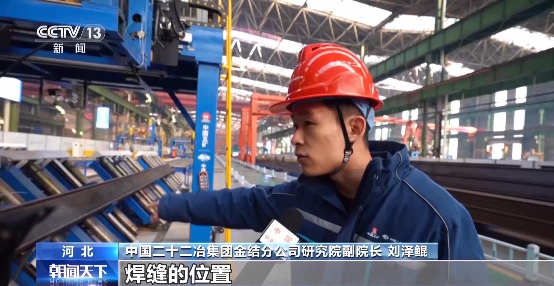 中国二十二冶集团金结分公司研究院副院长 刘泽鲲:前面的激光定位可以精确识别到我们焊缝的位置,它可以进行自动纠偏和校核。生产效率大概提高了三到五倍,我们整个产线它实际上只需要八个人就可以。