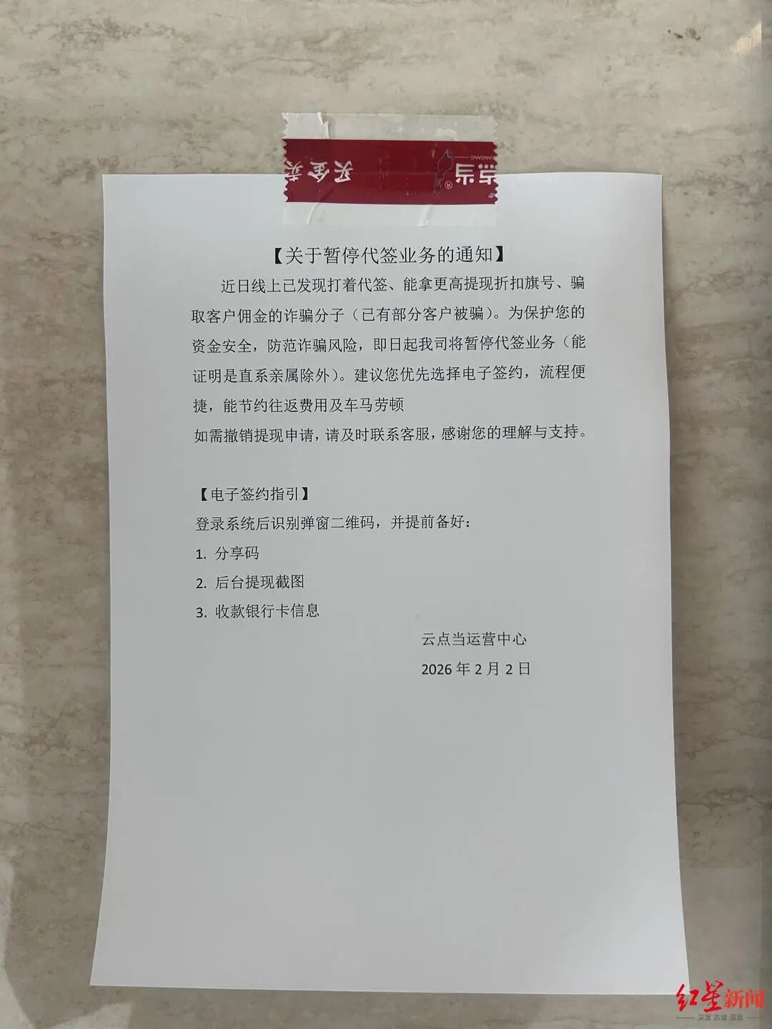 “为保护资金安全,防范诈骗风险,即日起我司将暂停代签业务(能证明是直系亲属除外)。”公告建议,用户可优先选择电子签约,流程便捷,能节约往返费用及车马劳顿。在该平台对外公布的期限中,“最快一周,最慢一个月,我们将全面恢复正常运营。”