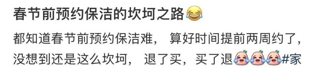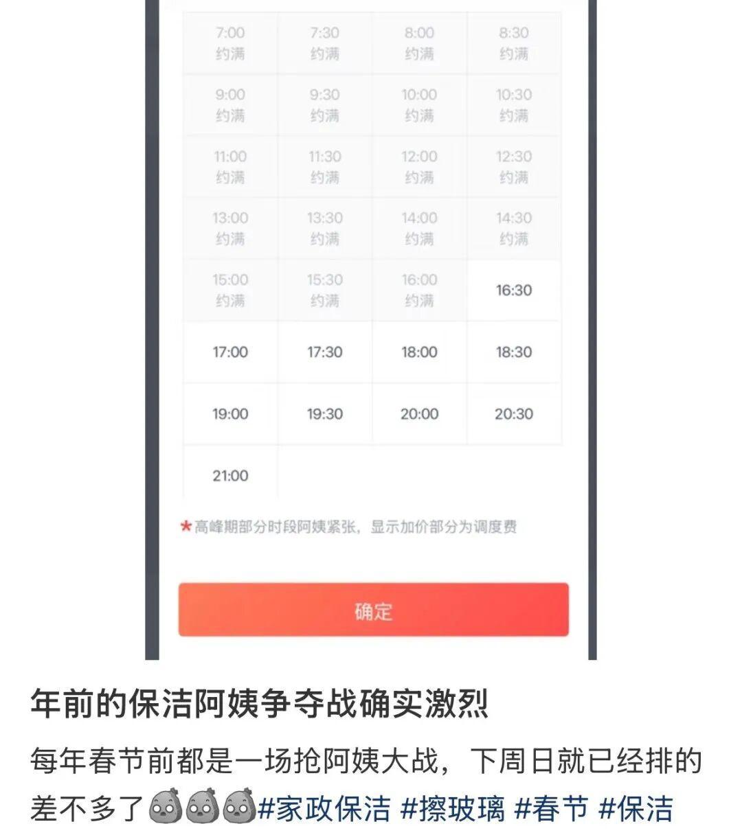“我提前两周就在小程序上抢到了一个周末的深度保洁档期,还特意加了擦窗服务。”杭州市民余女士对潮新闻记者说。市民余女士表示,家里有老人和小孩,自己工作又忙,只能请专业保洁。她选择的是线上小程序下单的3小时深度清洁、带擦窗的服务,总花费500元,花费比平时要贵一些。“虽然贵了点,但过年就要里里外外打扫一遍的,图个清爽。”