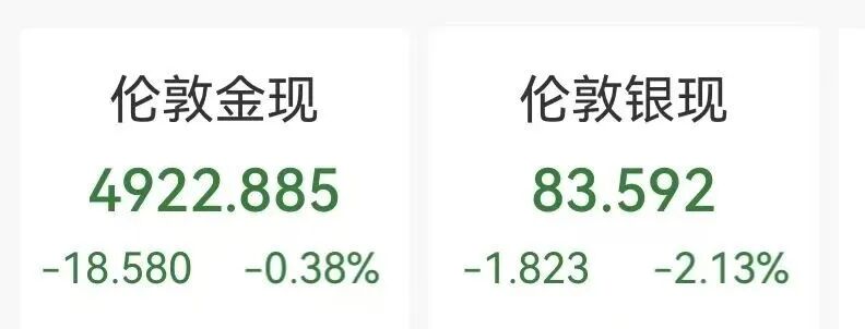 金银急速跳水:黄金由涨转跌,最新报4922美元/盎司;现货白银日内跌幅2%,报83.5美元/盎司