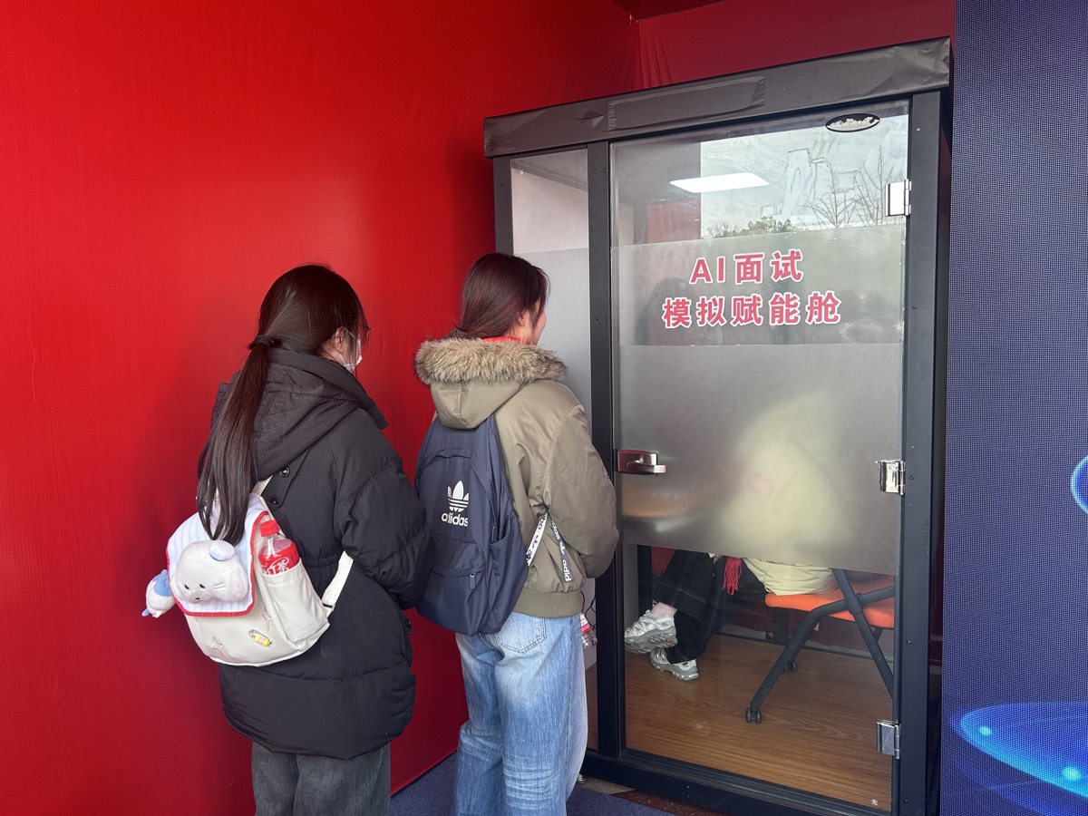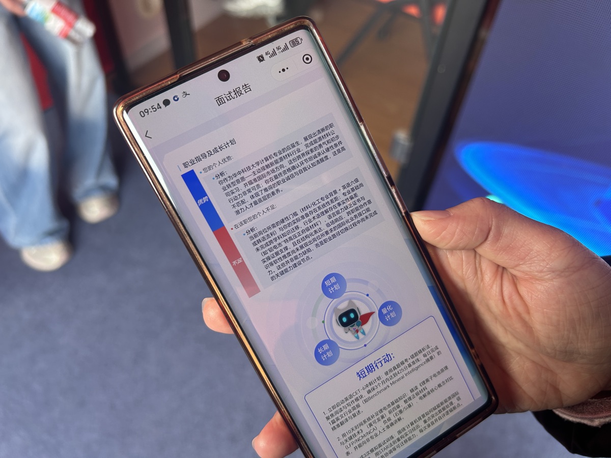 值得一提的是,仪式现场还设置了“AI赋能 精准就业”专区,求职者可进入AI面试模拟赋能舱进行提前AI面试,通过生成的分析报告找到自己的优势和不足,确定适合自己的岗位并更加顺利地参加面试。