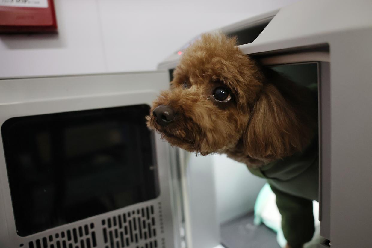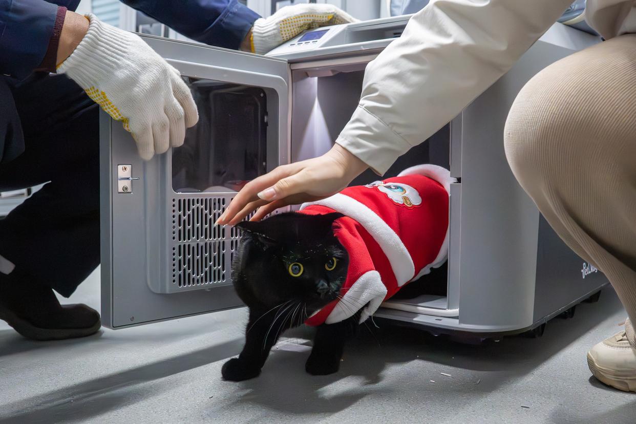 在营业部宠物交接间,业务员孙谦耐心地引导首批萌宠“旅客”进入“专座”——配备空气循环、含氧量和温湿度监测的高铁专用宠物运输箱。他提前在箱内备好饮用水,铺好尿垫。箱体液晶屏上,温度、湿度、氧气浓度等数据清晰可见。