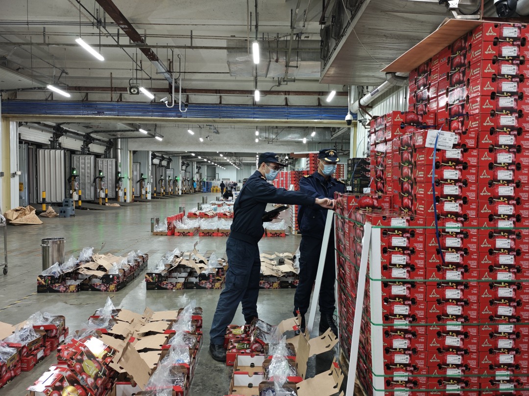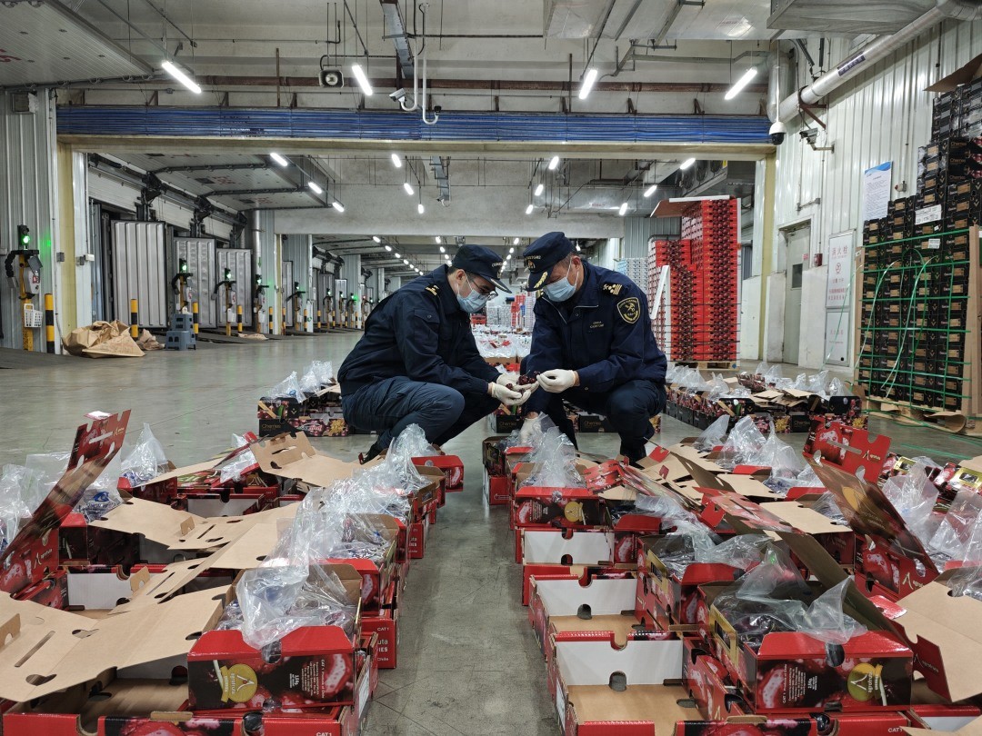 广州海关所属南沙海关关员对进口车厘子进行监管