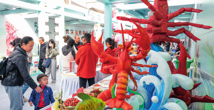 消费者在武汉市举办的2025 年“中华美食荟”湖 北潜江摊位参观(2025 年 3 月 17 日摄)肖艺九摄 / 本刊