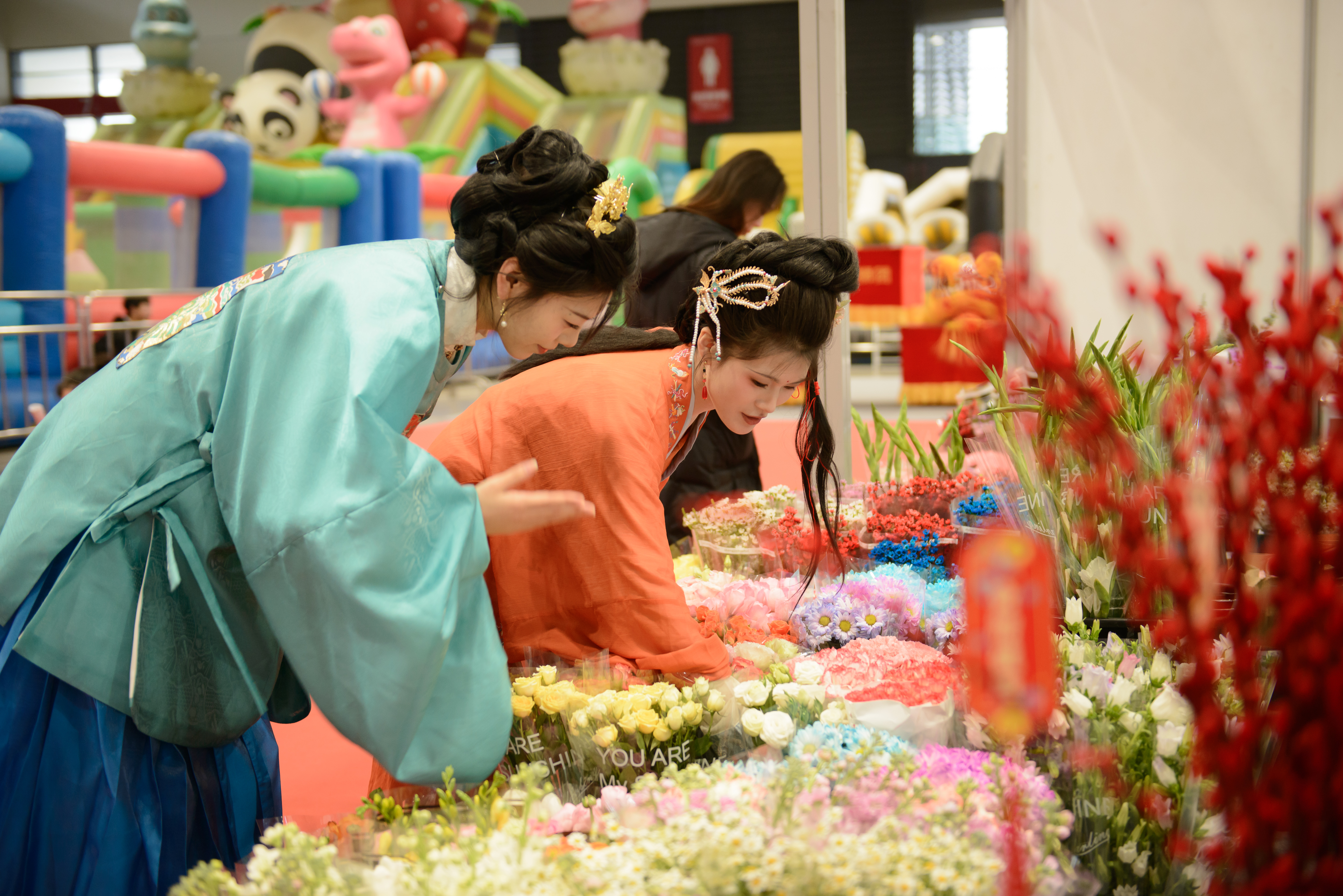 放眼望去,展馆内热闹非凡。伴随着咚咚鼓点,精彩的舞狮表演引起阵阵欢呼与掌声;家长带着孩子前来体验拓福字、剪窗花、投壶等互动游戏;穿梭在摊位之间的汉服爱好者们犹如一道亮丽的风景线,头顶簪花、披帛飘逸的吴女士正捧着刚买来的鲜花拍照,她笑着说:“穿着汉服来逛大集,也算是一种入乡随‘服’吧。一会儿我还要去看看那边的汉服走秀,听说现场还有很多打卡礼品可以领呢。”