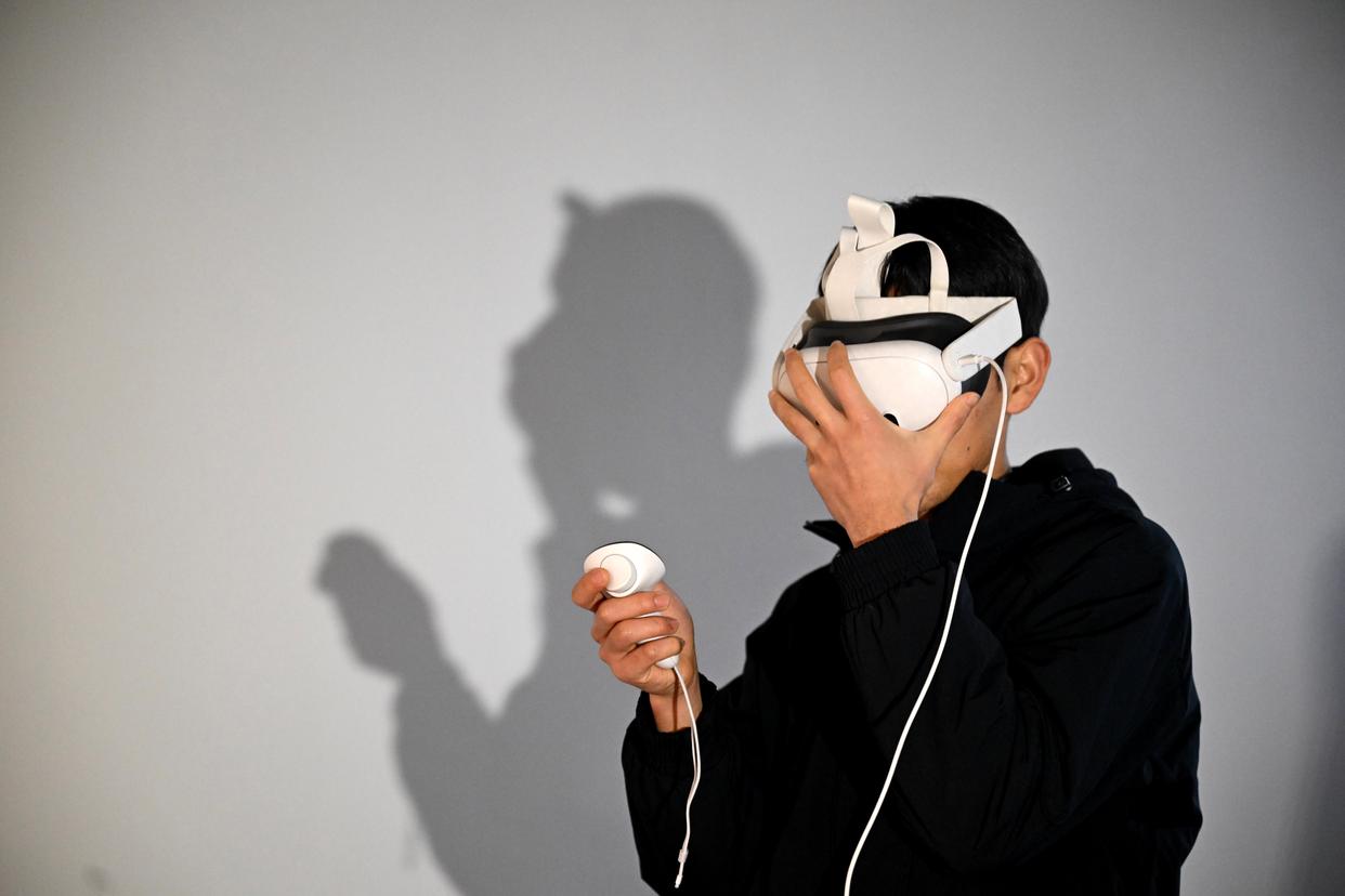 在广西柳州机器人产业园里,吴东波戴上AR眼镜与工业人形机器人进行作业练习(1月30日摄)。新华社发(黎寒池摄)
