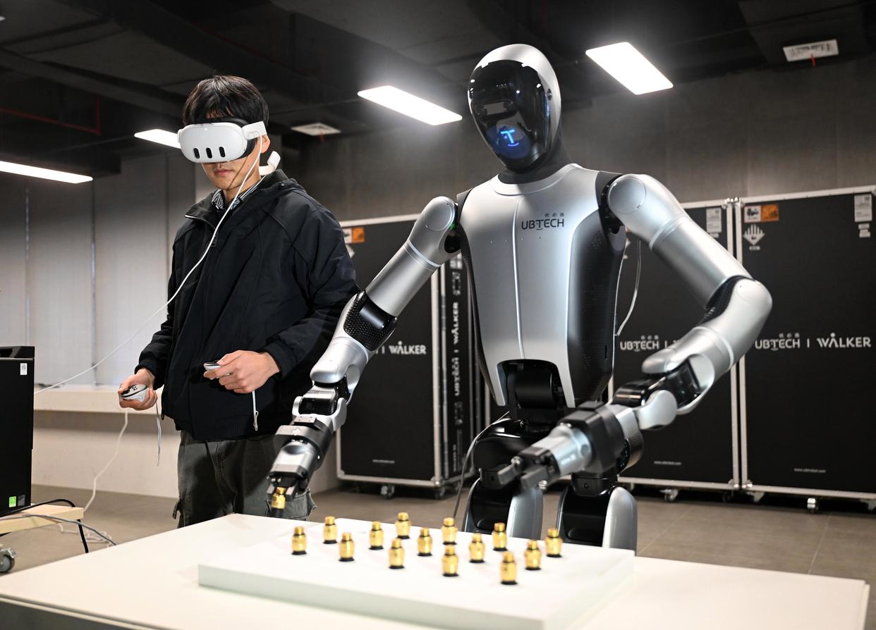2月11日,在广西柳州机器人产业园里,吴东波使用手柄指挥工业人形机器人进行搭积木练习。新华社发(黎寒池摄)