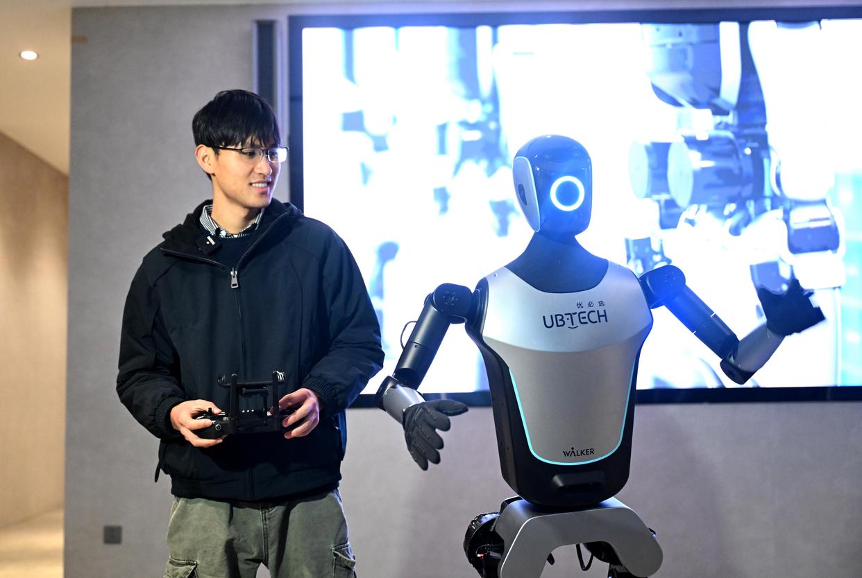 在广西柳州机器人产业园里,吴东波使用遥控器指挥工业人形机器人进行舞蹈练习(1月30日摄)。新华社发(黎寒池摄)