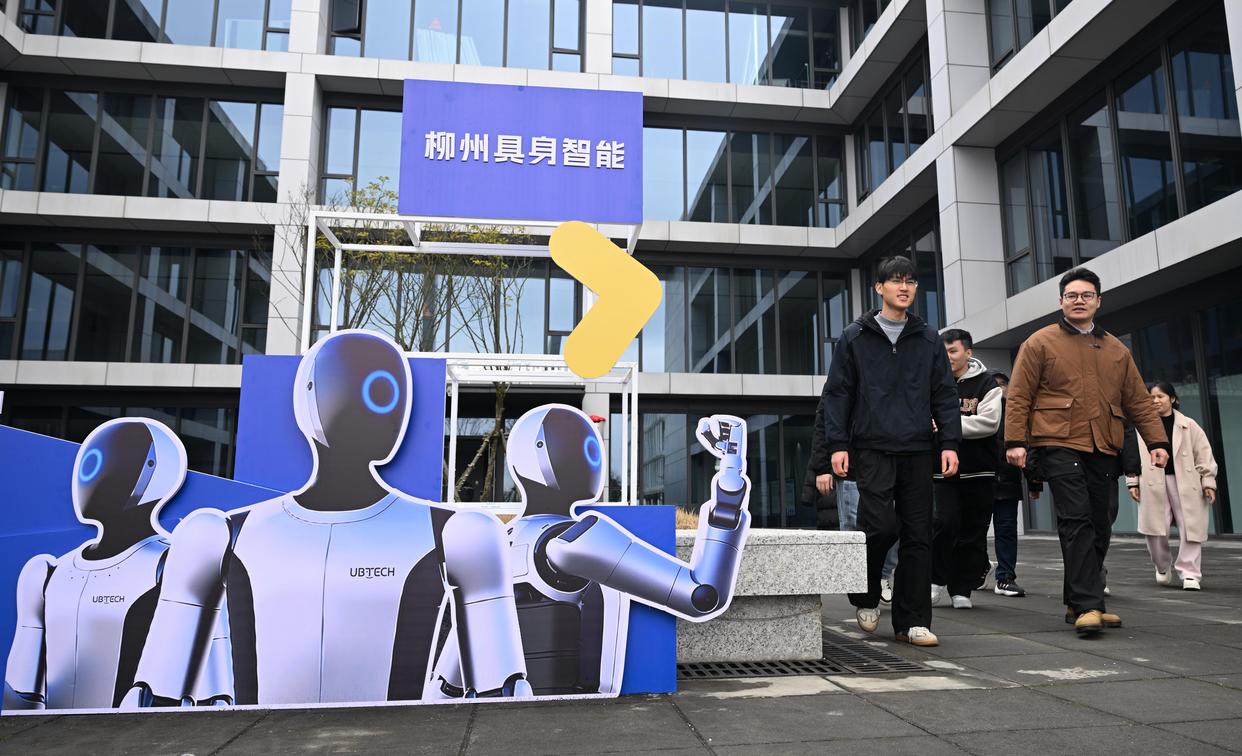 2月11日,在广西柳州机器人产业园里,吴东波(左一)与机器人训练师走出产业园。新华社发(黎寒池摄)