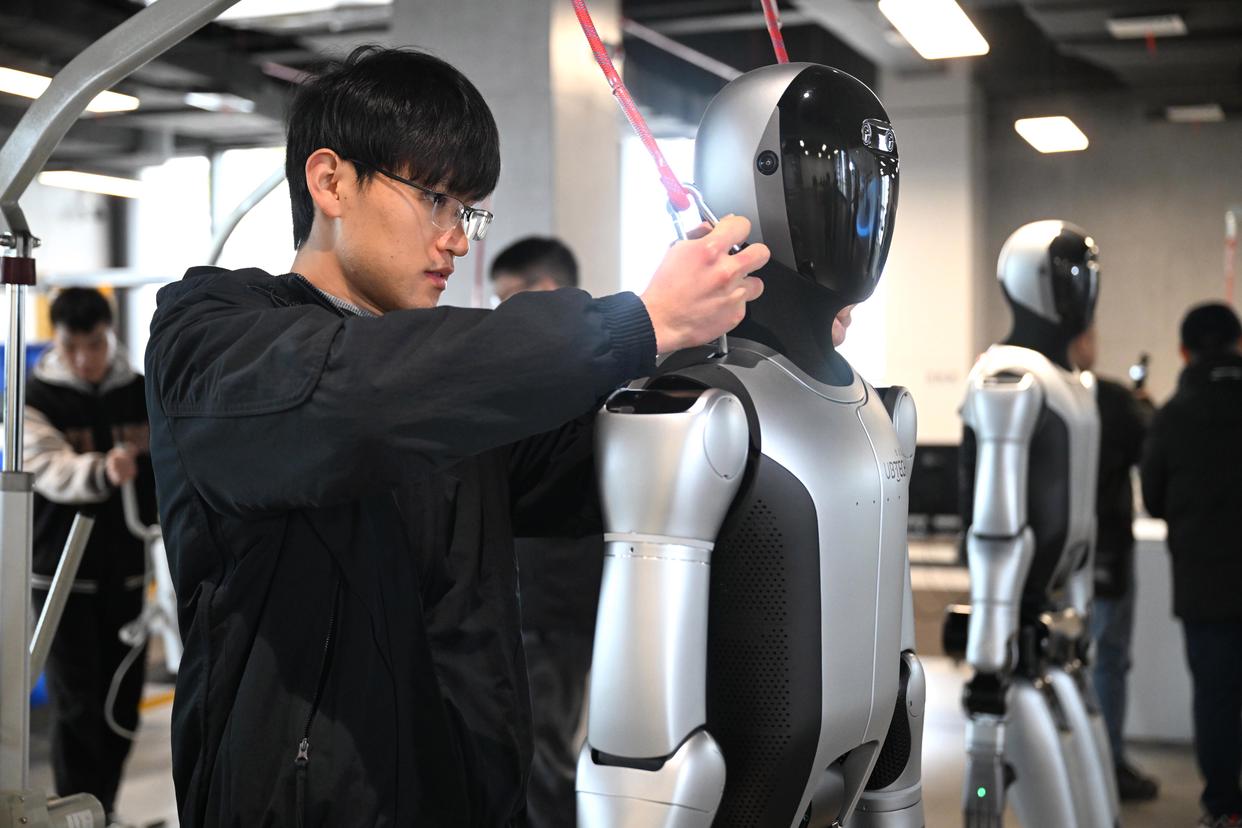 2月11日,在广西柳州机器人产业园里,吴东波摘取工业人形机器人挂钩进行作业动作练习。新华社发(黎寒池摄)