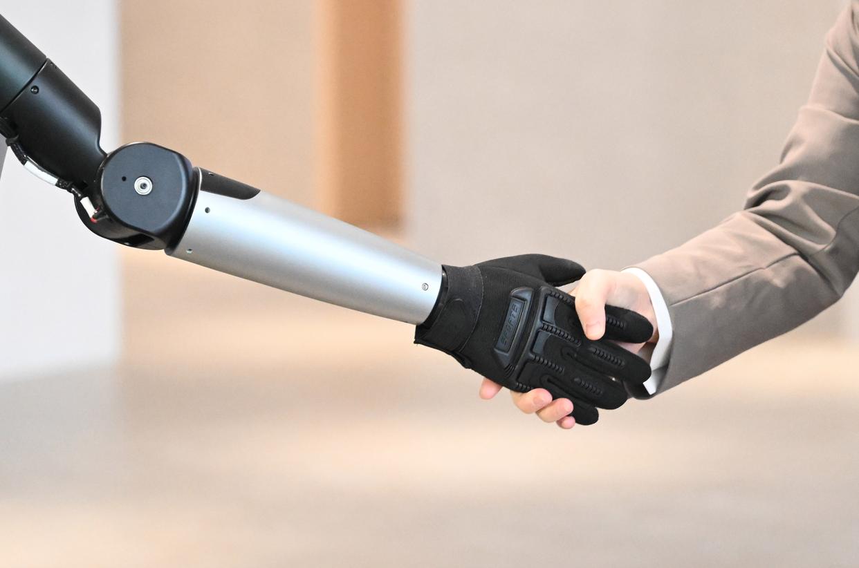 在广西柳州机器人产业园里,经过训练的工业人形机器人与来访嘉宾握手(1月30日摄)。新华社发(黎寒池摄)
