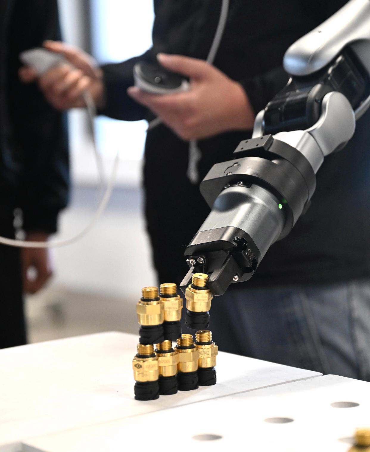 在广西柳州机器人产业园里,吴东波使用手柄与工业人形机器人进行拧螺丝练习(1月30日摄)。新华社发(黎寒池摄)