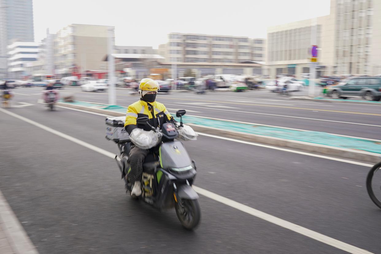 戚德敏骑行在送餐路上。新华社记者杨晨光 摄