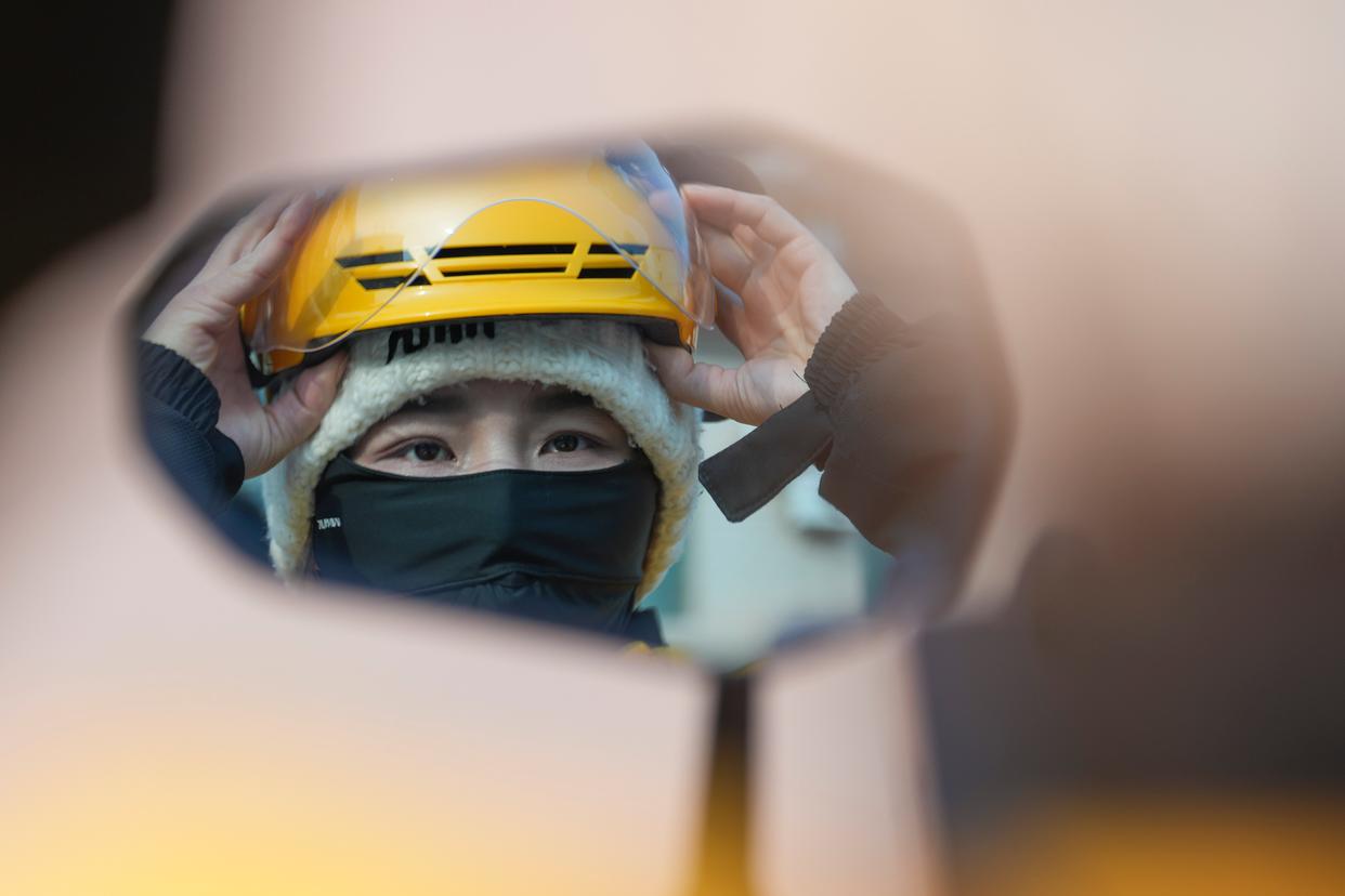 为了抵御严寒,她在安全头盔内套了一个棉帽,戴好口罩后,浑身上下已被包裹得严严实实,只露出一双明亮的眼睛。仔细擦干净电动车,戚德敏的一天,就在城市尚未完全苏醒的晨光里开始了。