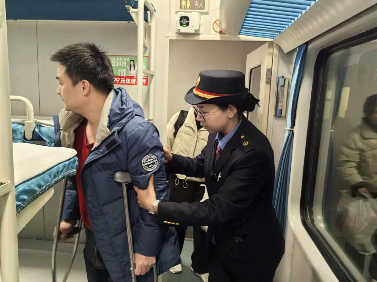 来自河南洛阳的洛城女孩师曼迪,秉承着中原大地的坚韧,主动搀扶拄拐的旅客,一手稳稳扶住他的胳膊,一手轻托着他的手肘,一步步护送其就座,贴心整理行李,让行动不便的旅客感受到铁路服务的细致与周到。