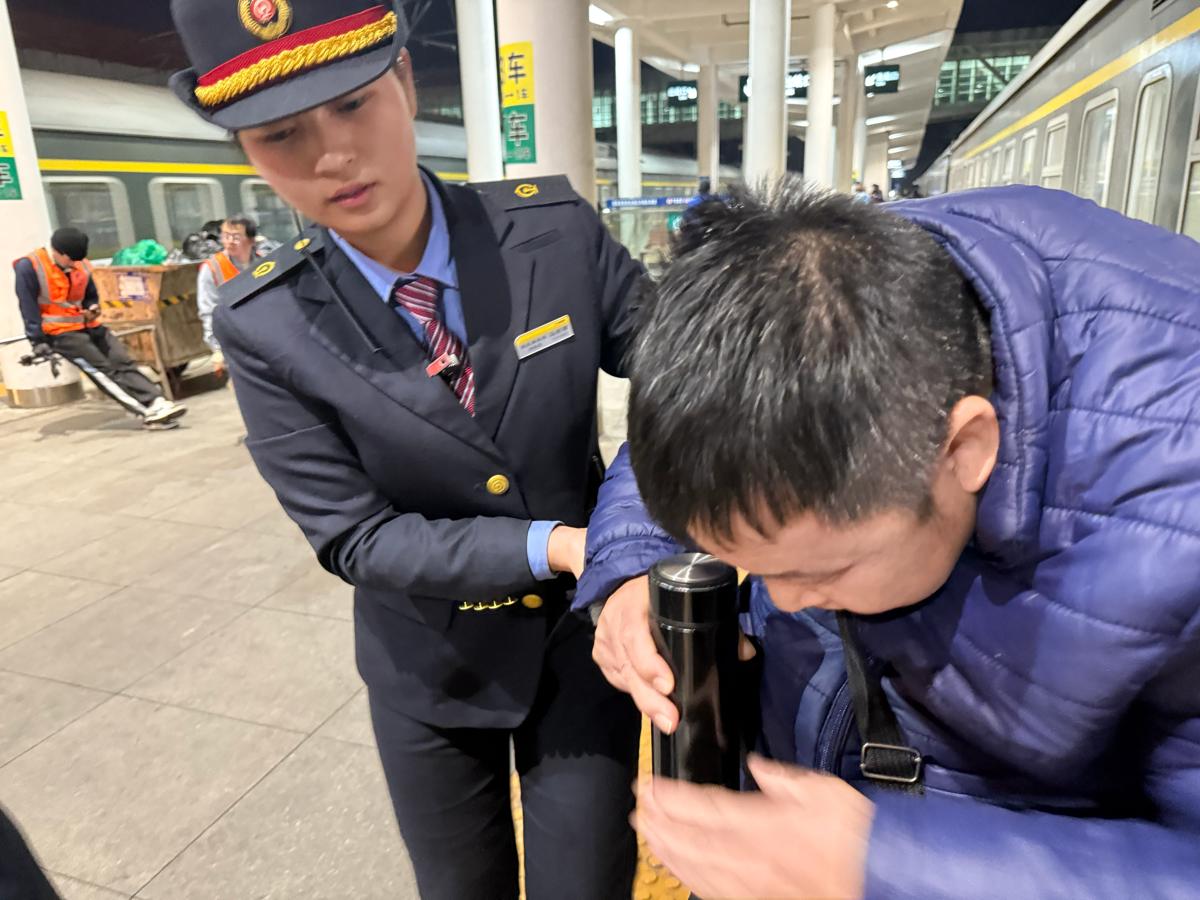 来自河南焦作的姑娘马舒雨,带着太行山下的质朴,在深夜的站台,看到一位旅客身体不适、弯腰呕吐,她立刻上前,递上热水、轻声安抚,又主动联系车站工作人员协调后续帮助,用点滴行动诠释着“人民铁路为人民”的初心,让旅客在寒冷的深夜里感受到了实实在在的温暖。