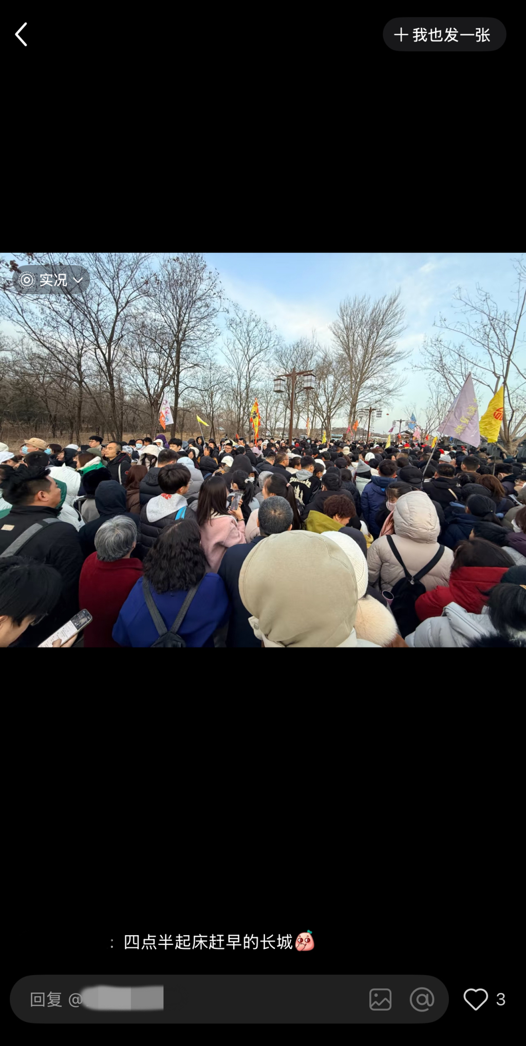 有网友称自己四点半起床赶早爬长城,其发布的照片里可见的则是满屏的人头。