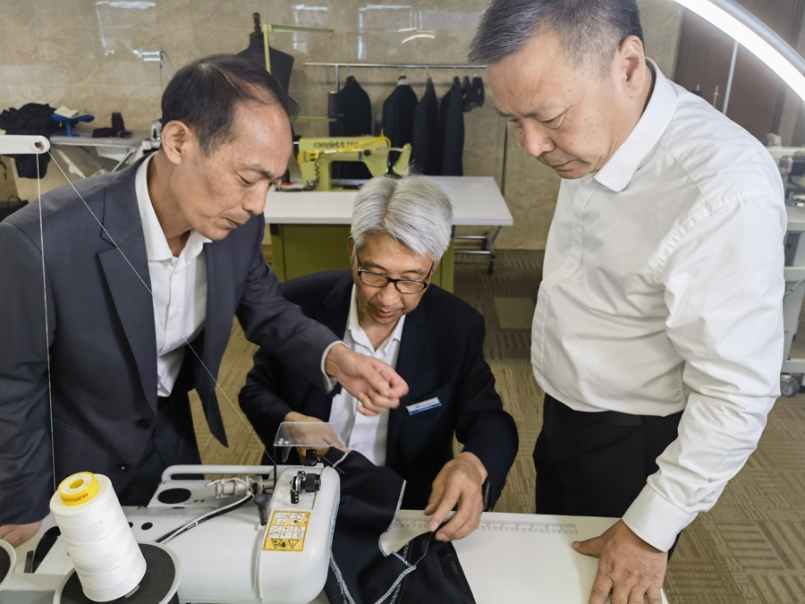 他至今清晰地记得团队为国际质量协会专家吉米?哈林顿定制西服的经历。这位专家身高1.9米、体重达200公斤,平日里就很难买到合身的成衣,量体时甚至一把卷尺都不足以完整测量。面对这样的特殊体型,大家突破常规裁剪思路,反复研究方案,最终采用平面裁剪与立体裁剪相结合的方式,完成了这次“极限挑战”——一套西服外加两条裤子,用料足足8米,是常规用量的两倍。