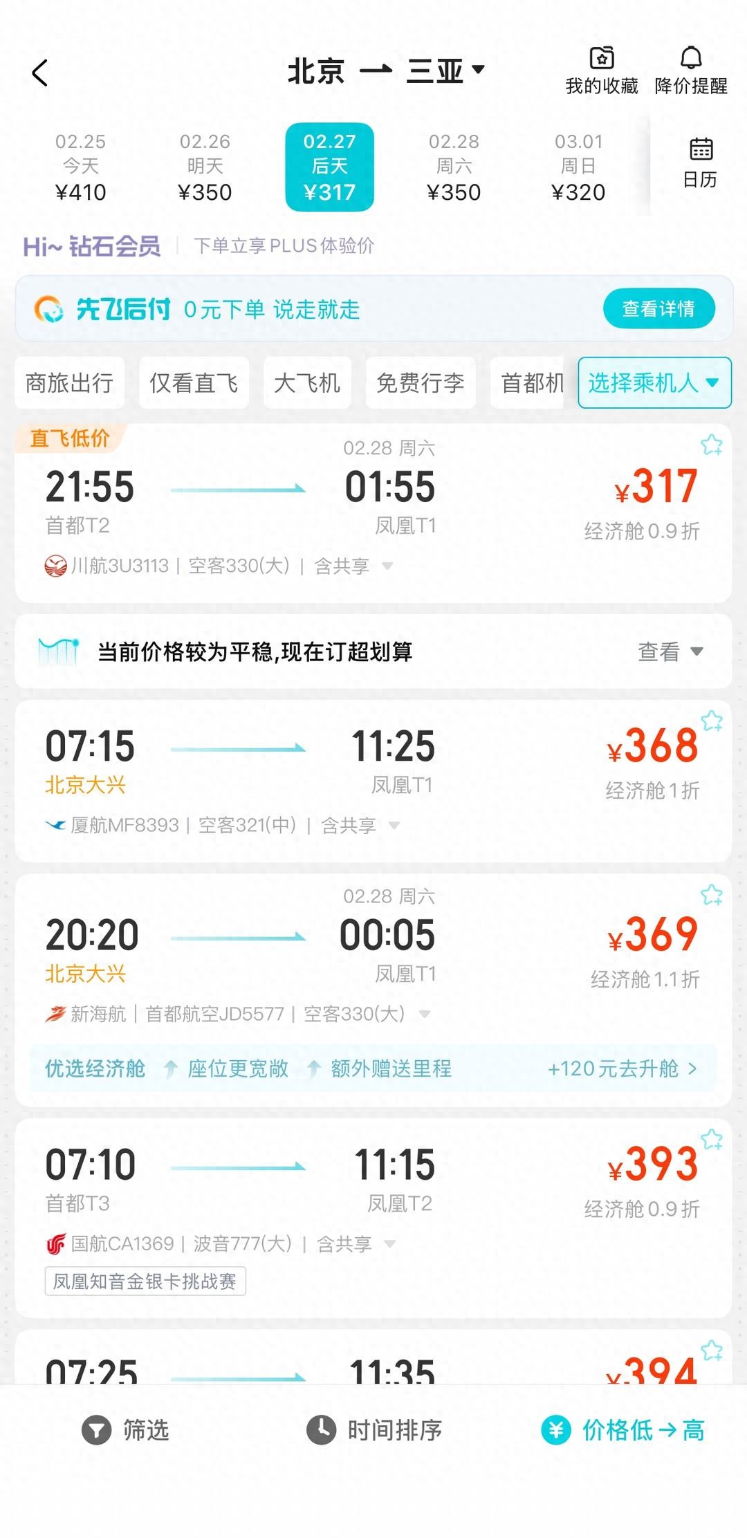 北京至三亚方向最近几天的机票有很多都在300多元 图据出行平台