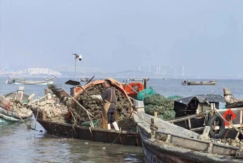 “这是今冬最后一批了,收完这几船,今年的冬蛎子就算圆满收官!”渔民们兴奋地说。船舱里堆满了刚捕捞上来的海蛎子。靠岸后,码头进入“高速运转”模式:搬运、分拣、过秤、装车,一气呵成。不少商贩从市区、周边区县赶来,就为第一时间装上最新鲜的神汤沟海蛎子。