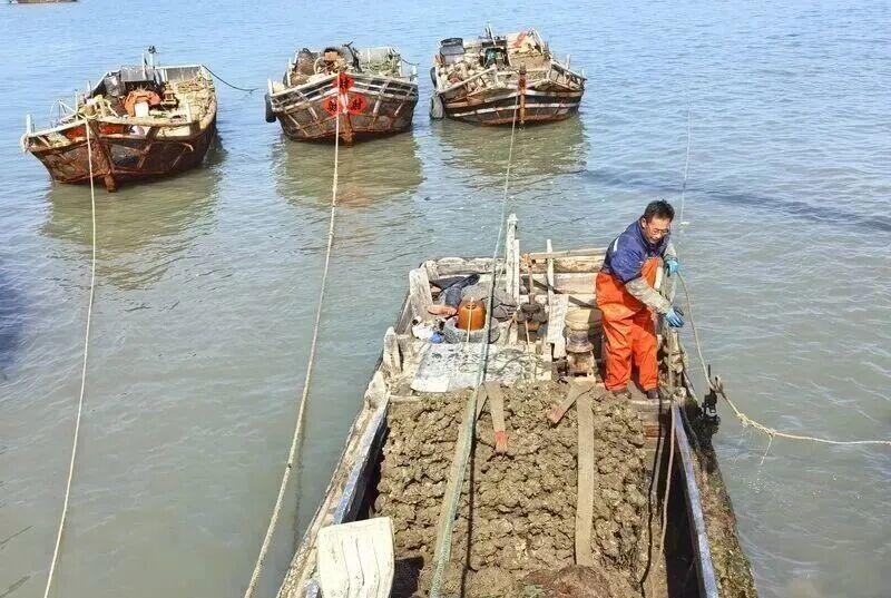 渔民开船拉回海蛎子。
