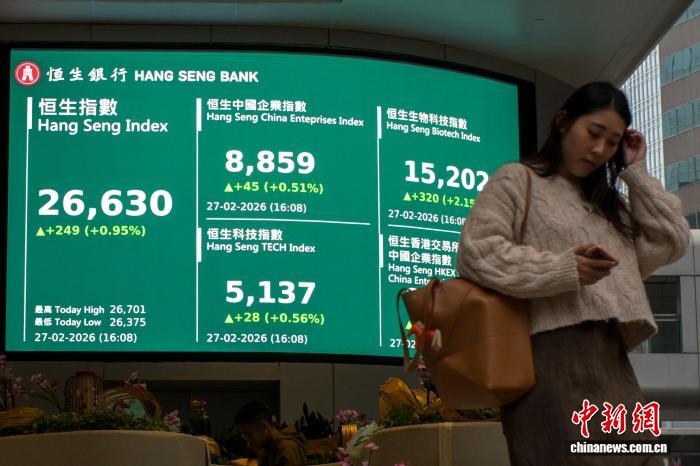 中新社香港2月27日电(记者戴小橦)港股市场2月行情27日正式收官,截至当日收盘,三大指数集体收涨,恒生指数报26630.54点,上涨249.52点,涨0.95%,恒生科技指数涨0.56%,国企指数涨0.51%。