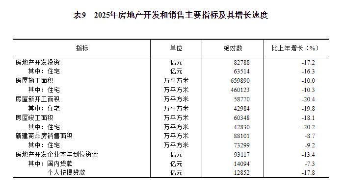 全年房地产开发投资82788亿元,比上年下降17.2%。其中住宅投资63514亿元,下降16.3%;办公楼投资3203亿元,下降22.8%;商业营业用房投资5947亿元,下降14.0%。全年新建商品房销售面积88101万平方米。二手房交易网签面积73685万平方米。年末新建商品房待售面积76632万平方米,其中商品住宅待售面积40236万平方米。
