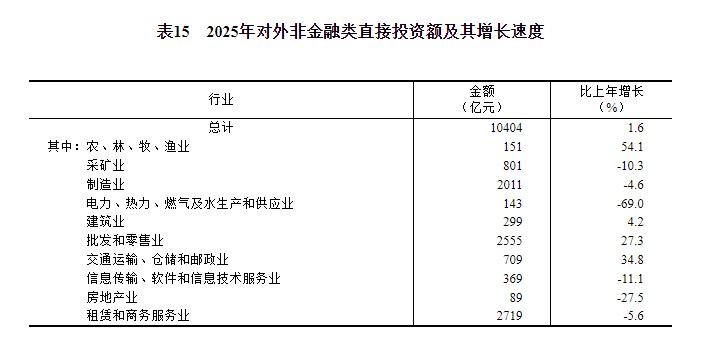 全年对外非金融类直接投资额10404亿元,比上年增长1.6%。其中,对共建“一带一路”国家非金融类直接投资额2834亿元,增长18.0%。