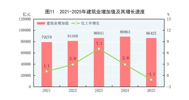 全年建筑业增加值86425亿元,比上年下降1.1%。全国具有资质等级的总承包和专业承包建筑业企业利润6355亿元,比上年下降14.1%,其中国有控股企业利润3473亿元,下降8.2%。