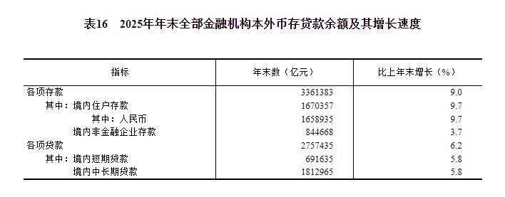 全年社会融资规模增量35.6万亿元,按可比口径计算,比上年多3.3万亿元。年末社会融资规模存量442.1万亿元,按可比口径计算,比上年末增长8.3%,其中对实体经济发放的人民币贷款余额268.4万亿元,增长6.3%。年末全部金融机构本外币各项存款余额336.1万亿元,比年初增加27.8万亿元,其中人民币各项存款余额328.6万亿元,增加26.4万亿元。全部金融机构本外币各项贷款余额275.7万亿元,增加16.2万亿元,其中人民币各项贷款余额271.9万亿元,增加16.3万亿元。人民币普惠小微贷款余额36.6万亿元,增加3.6万亿元。本外币涉农贷款余额53.6万亿元,增加3.4万亿元;制造业中长期贷款余额14.9万亿元,增加1.0万亿元;绿色贷款余额44.8万亿元,增加7.7万亿元。全年全国新发放企业贷款加权平均利率3.22%,比上年下降41个基点。