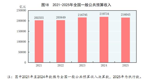 全年全国一般公共预算收入216045亿元,比上年下降1.7%;其中税收收入176363亿元,增长0.8%。全国一般公共预算支出287395亿元,比上年增长1.0%。全年现行支持科技创新和制造业发展的主要政策减税降费及退税金额28557亿元。
