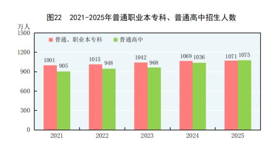 全年研究生教育招生143.8万人,在学研究生430.0万人,毕业生116.7万人。普通、职业本专科招生1070.8万人,在校生3954.0万人,毕业生1105.1万人。中等职业教育招生526.5万人,在校生1537.8万人,毕业生521.9万人。普通高中招生1074.9万人,在校生3039.5万人,毕业生924.6万人。初中招生1852.8万人,在校生5509.3万人,毕业生1723.7万人。小学招生1461.7万人,在校生10178.3万人,毕业生1860.5万人。特殊教育招生16.4万人,在校生92.7万人,毕业生18.4万人。学前教育在园幼儿3225.5万人。九年义务教育巩固率为96.1%,高中阶段毛入学率为92.0%。16—59岁人口平均受教育年限为11.3年,比上年提高0.1年。