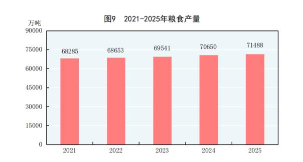 全年粮食产量71488万吨,比上年增加838万吨,增产1.2%。其中,夏粮产量14975万吨,减产0.1%;早稻产量2851万吨,增产1.2%;秋粮产量53662万吨,增产1.5%。谷物产量66021万吨,比上年增产1.2%。其中,稻谷产量20904万吨,增产0.7%;小麦产量14007万吨,基本持平;玉米产量30124万吨,增产2.1%。大豆产量2091万吨,比上年增产1.3%。