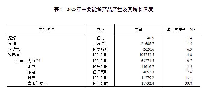 初步核算,全年一次能源生产总量51.3亿吨标准煤,比上年增长3.6%。
