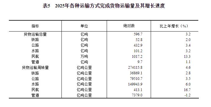 全年货物运输总量597亿吨,比上年增长3.2%。货物运输周转量274116亿吨公里,增长4.6%。港口完成货物吞吐量183亿吨,比上年增长4.2%,其中外贸货物吞吐量57亿吨,增长4.7%。港口集装箱吞吐量35447万标准箱,增长6.8%。
