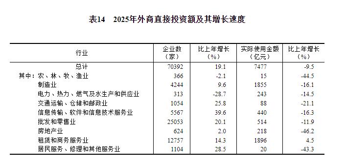 全年新设立外商投资企业70392家,比上年增长19.1%。实际使用外资金额7477亿元,下降9.5%。其中,共建“一带一路”国家(含通过部分自由港对华投资)对华新设立外商投资企业19756家,增长14.7%;对华直接投资1168亿元,增长1.9%。高技术产业实际使用外资2418亿元,下降15.6%。
