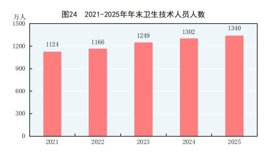 年末全国共有医疗卫生机构110.7万个,其中医院3.8万个,在医院中有公立医院1.2万个,民营医院2.6万个;基层医疗卫生机构105.5万个,其中乡镇卫生院3.3万个,社区卫生服务中心(站)3.8万个,门诊部(所)42.4万个,村卫生室56.0万个;专业公共卫生机构9231个(不含卫生监督所、中心),其中疾病预防控制中心3478个。卫生技术人员1340万人,其中执业医师和执业助理医师529万人,注册护士603万人。医疗卫生机构床位1009万张,其中医院799万张,乡镇卫生院144万张。全年总诊疗人次105.8亿人次,出院人次3.0亿人次。