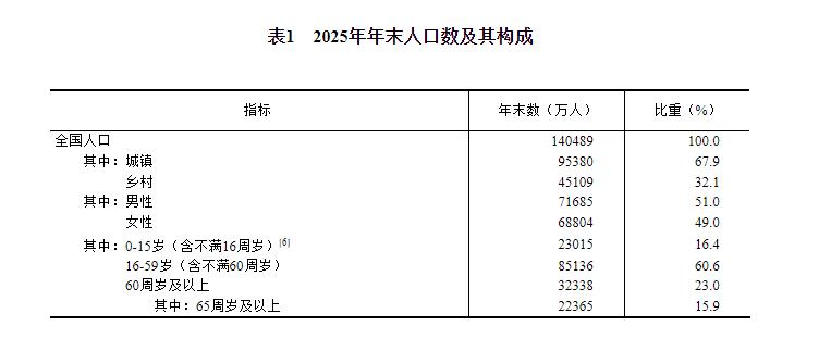 年末全国人口140489万人,比上年末减少339万人,其中城镇常住人口95380万人。全年出生人口792万人,出生率为5.63‰;死亡人口1131万人,死亡率为8.04‰;自然增长率为-2.41‰。