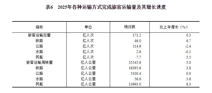 全年旅客运输总量171亿人次,比上年增长0.3%。旅客运输周转量35546亿人公里,增长5.0%。