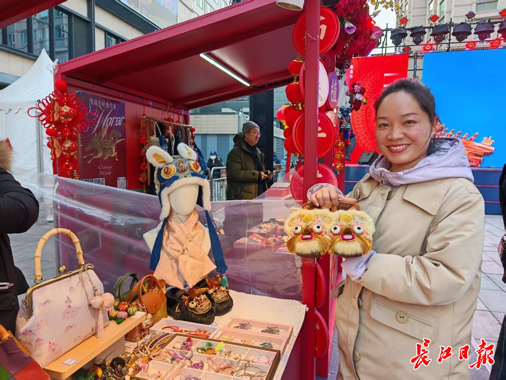 在主舞台旁,布美手工艺工作室被打围,摊头摆着的虎头鞋很受欢迎,多位客人现场下订单。工作室负责人妮娜告诉记者:“小年这一天,总书记摸了摸我们做的虎头鞋,祝我们‘生意兴隆’!我激动地回了一句‘新年快乐’。那一刻,真的让人终生难忘。”