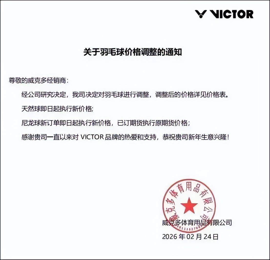 2月24日,VICTOR威克多率先宣布调价。接着斯庄格、齐克努也宣布调价。齐克努表示根据市场羽毛价格调节,公司决定对全系列羽毛球降价6元/筒。