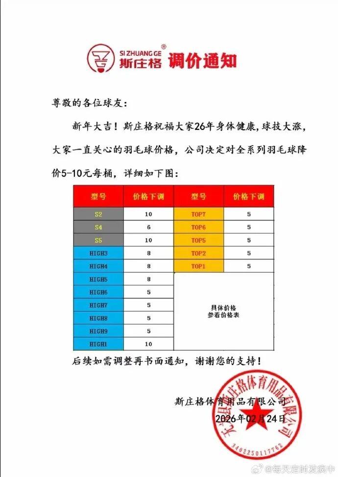 2月28日,羽毛球的龙头企业亚狮龙,也发布了降价通知。超牌、威肯……不少品牌陆续跟上降价的步伐。尤尼克斯(YONEX)至今未发布官方降价通知,但终端价格已随库存消化开始松动。