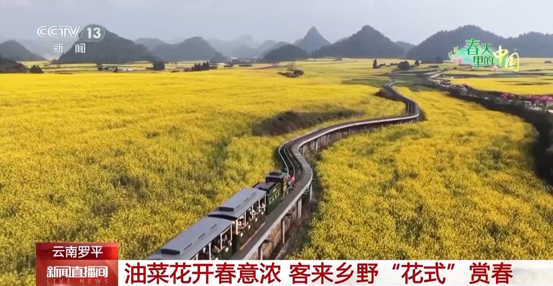 在云南曲靖市罗平县,百万亩油菜花进入最佳观赏期,金灿灿的花海缀满乡野,八方游客纷至沓来,当地也推出了一系列赏花新玩法。