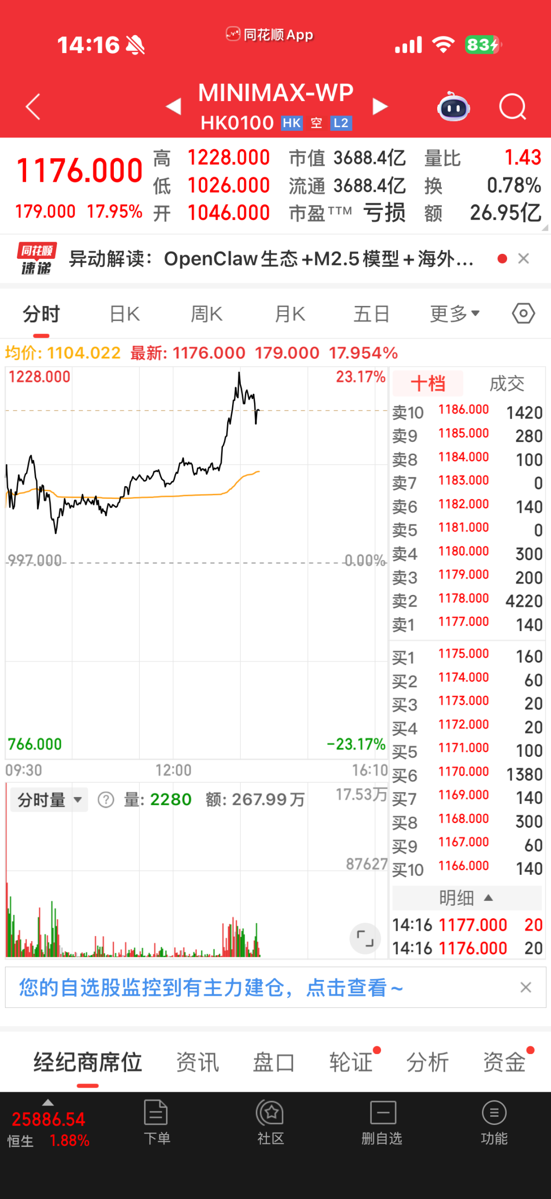 做通用人工智能的MiniMax,因为“养龙虾”需要它的模型提供支持,股价直接起飞了。昨天该股从800港元涨到了997港元,暴涨23.77%,今天再度暴涨之后,来到了1200港元,市值两天涨了1300亿港元。