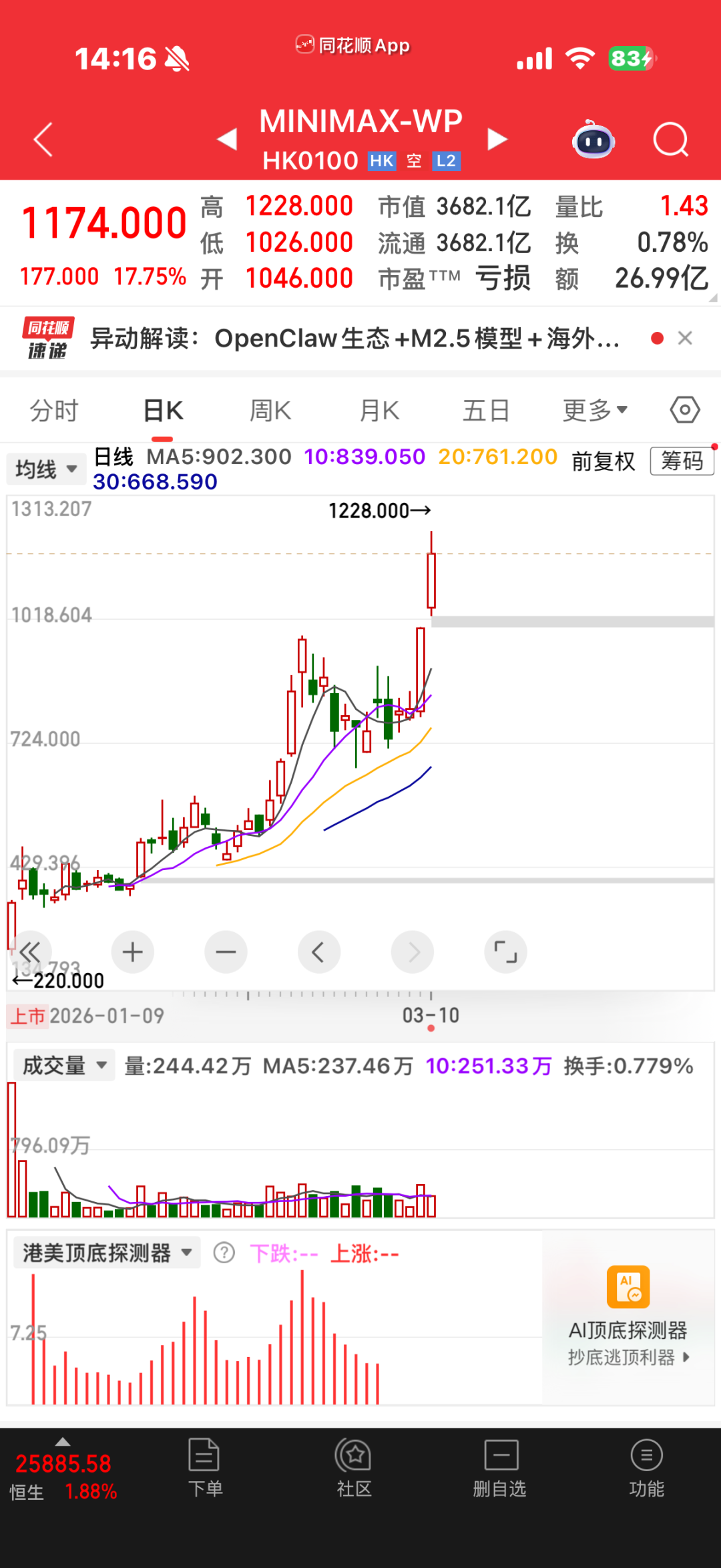 随着OpenClaw的AI智能体在科技圈爆火,相关概念股集体躁动。其中,国产大模型“六小虎”之一的MiniMax股价一度飙涨超23%,盘中最高冲至1228港元,刷新上市以来新高。截至发稿,公司股价报1191港元,总市值高达3729亿港元。