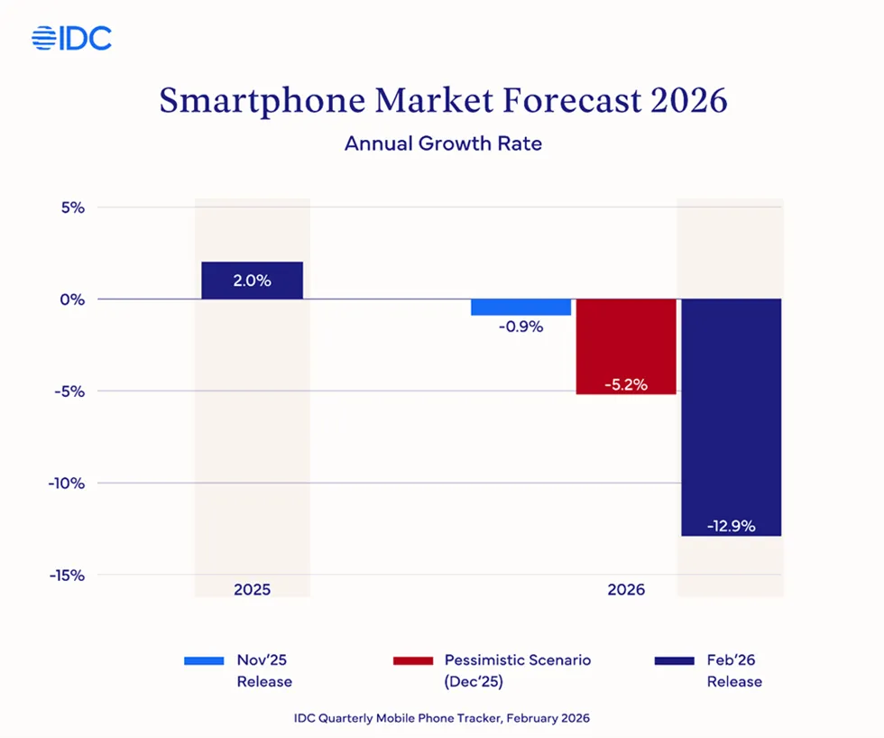 调研机构IDC预测,2026年全球手机出货量将下降12.9%,收入下降0.5%。2027年预计增长1.9%,2028年反弹至5.2%。