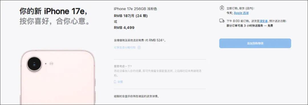 iPhone17e提供256GB、512GB两种存储版本,售价分别为4499元和6499元。
